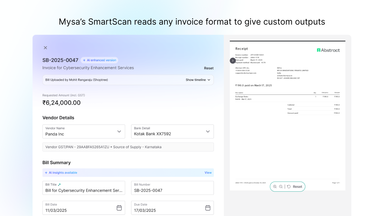 Mysa Smart Scan: Beyond OCR Mysa SmartScan: Get insights and accurate scan results every time Mysa Smart Scan isn’t just another OCR engine. It’s an AI-powered inference system trained on over 100,000+ real Indian invoices. It understands messy, non-standard documents the way a finance team would. Modern AI-powered OCR in Mysa goes far beyond simple text recognition.