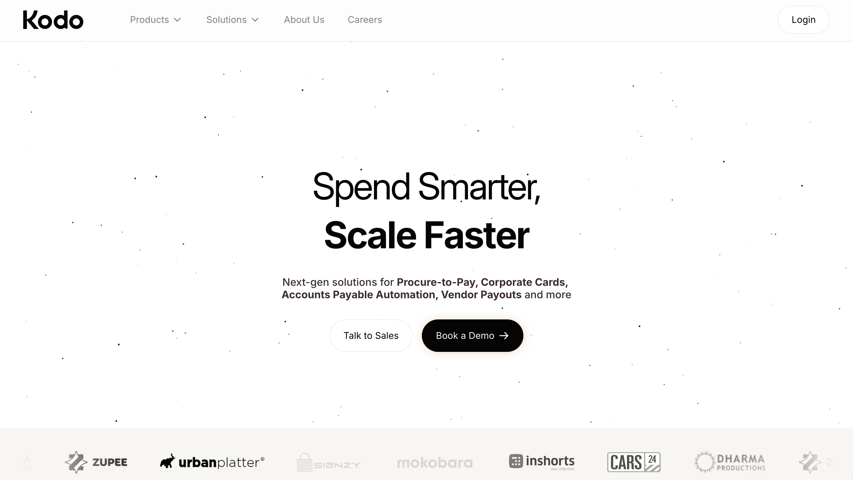 9. Kodo Kodo Overview Kodo is a one-stop spend management platform tailored to Indian startups and mid-market businesses. Established in 2019 and funded by Y Combinator, Kodo has an end-to-end intake-to-pay solution that integrates corporate cards, accounts payable automation, procurement management, and expense management in one seamless platform. Adopted by top companies such as Cars24, Mensa Brands, and Zetwerk, Kodo turns financial mess into clarity through streamlined purchase decisions, automated routine tasks, and easy payments.